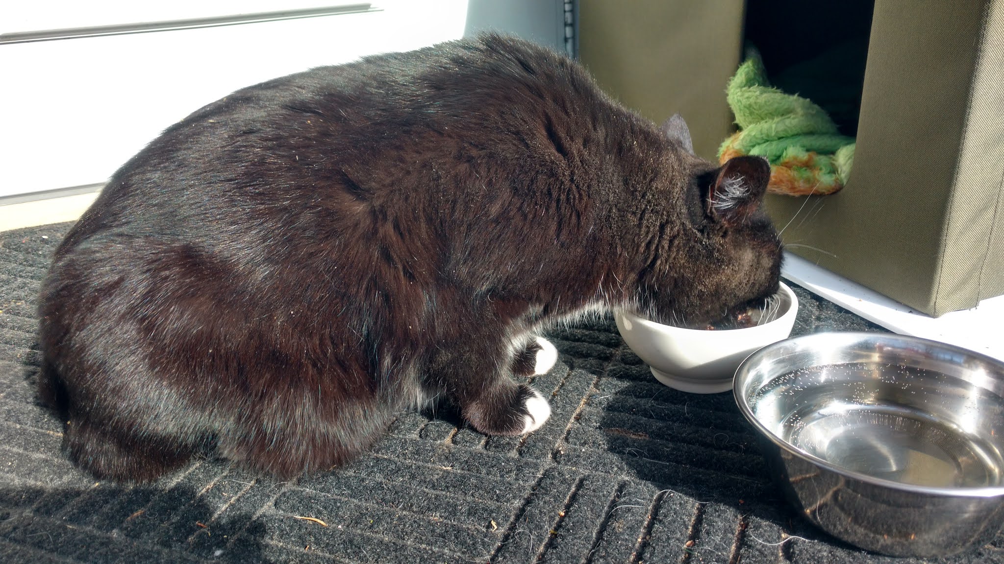 By this point, the cat was waiting at the door to be fed in the morning and evening. The ex had the morning slot, I, the evening. When we would open the door, the cat would run down the steps and wait until we set the bowl down. We'd retreat and they would come back for the food.