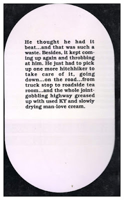 He thought he had it beat... and that was such a waste. Besides, it kept coming up again and throbbing at him. He just had to pick up one more hitchhiker to take care of it, going down... on the road... from truck stop to roadside tea room... and the whole joint-gobbling highway greased up with used KY and slowly drying man-love cream.